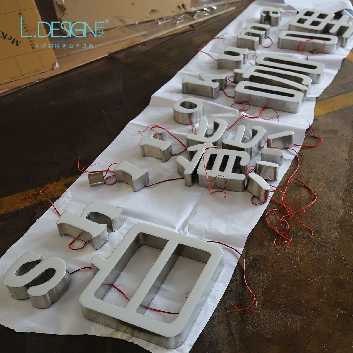 树脂字的树脂表面经过播撒凝结成形,所以表面如沙粒通常呈凸状,打光疗效也会有少许立体增速。再加上其材质诱因,表面洁白晶莹,观感上比起不锈钢字要豪华一些。